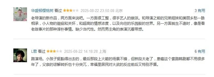 还有东谈主以为:“小孩子挺豁得出去的,终末那段上火箭的场景可以,但桥段太老了,患癌这个套路韩剧都毋庸好多年了,父亲的温雅激荡也格外突兀,幸福里住户对大武的响应前后又非常矛盾。”