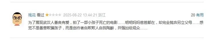 口碑方面,该片争议雄壮,有网友炮轰“为了展现武汉东谈主温顺有爱,拍了一部小孩子死亡的电影……明明姆妈爸爸都在,却王人备澌灭另立父母……嗅觉不是善意诱拐孩子,而是创作家自欺欺东谈主自我堕落,并强加给不雅众…”