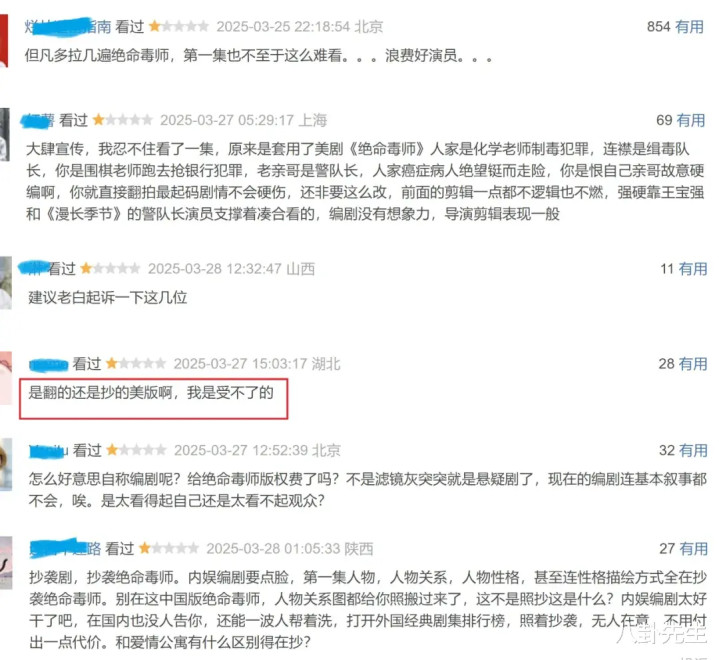 这些算是小错误了,白壁微瑕,毕竟很少有悬疑剧能经得起深究,剧情没大逻辑随意就行。但怒放某瓣一看,一堆一星差评,我不禁怀疑宇宙看的是归并部剧吗?无数差评集中在两个方面,一方面是谴责《棋士》抄袭了爆款好意思剧《绝命毒师》,以致有东说念主说它是“汉化版”,还有东说念主以为是翻拍。