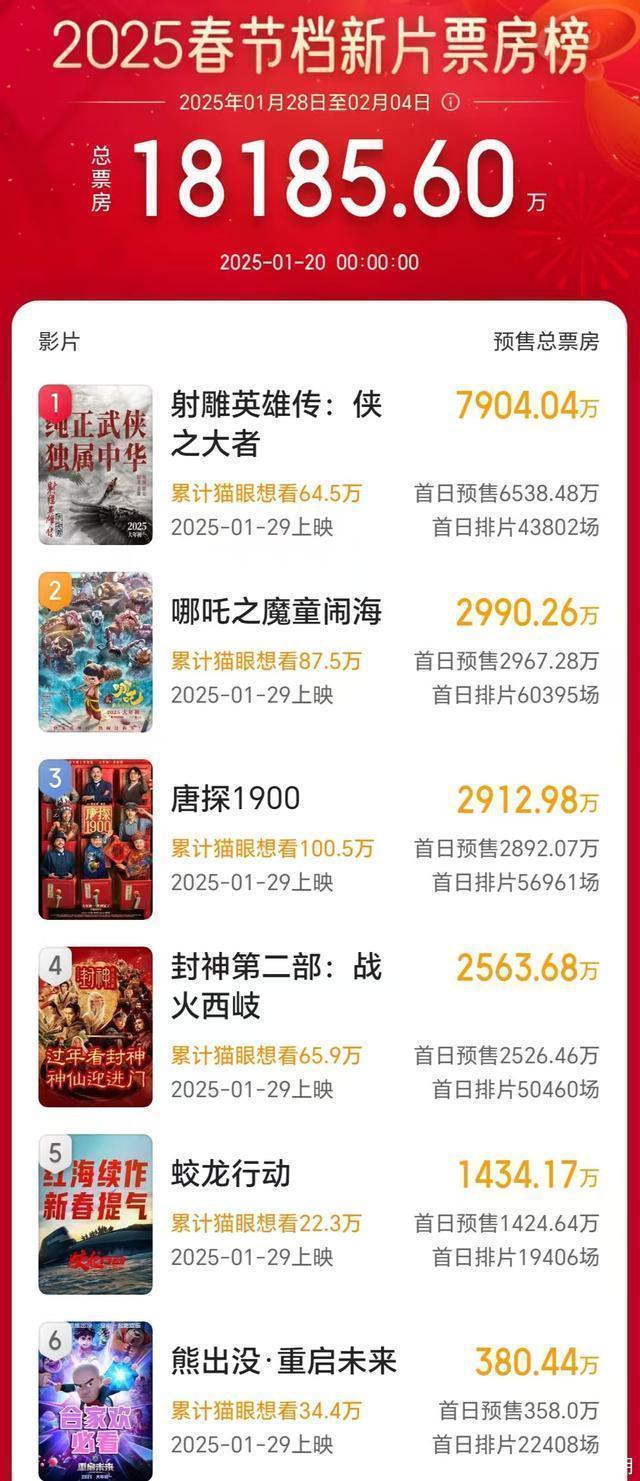2025年1月19日,那是一个注定被记起在中国电影史上的日子,春节档新片的预售崇敬拉开了大幕。就像一场恢弘的狂欢派对刚刚开启门扉,不雅众们的关怀便如潮流般滂沱而入。只是1小时40分钟啊,你能思象吗?2025春节档预售总票房就像火箭般蹿升,一下子就打破了3000万。这还不是至极,它就像一个不知疲惫的冲刺者,接连冲破5000万、1亿的大关,况兼还罕见霸气地刷新了中国影史春节档预售最快破亿的记载。最终,在预售首日,票房超1.8亿,这个数字就像一座耸入云霄的山岳,创下了影史春节档预售首日票房的新记载。在我看来,这是一个极度惊东谈主的发轫,仿佛是电影阛阓在千里寂之后发出的一声吼怒,宣告着它行将开启一段光芒的旅程。