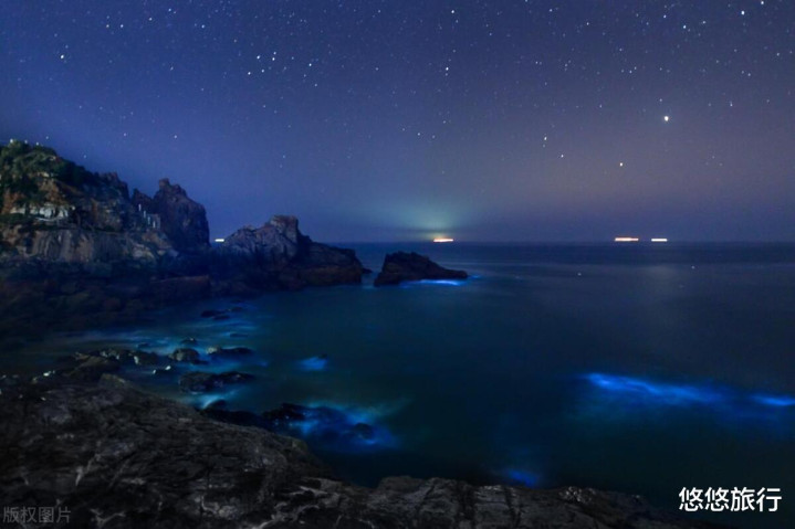 东好意思村落潮后沙滩现蓝色脚印,像踩着星河散布。渔港夜景打光+蓝眼泪,氛围感径直拉满。