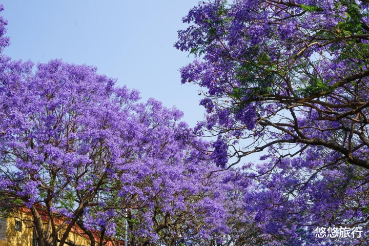 教场中路的蓝花楹按期开放,将整条街谈染成紫色,五一本事已是盛花期,花期赓续到5月中旬。