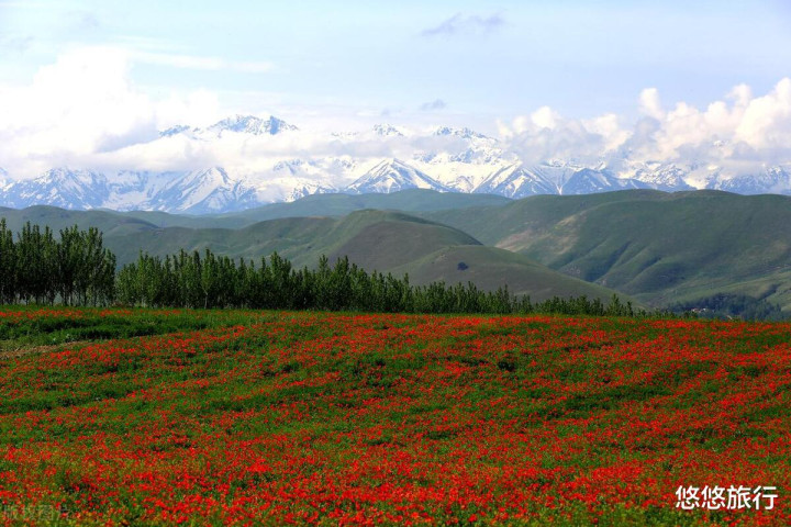 霍城县如满江沟、三宫乡,漫天遍地的红花在阳光映照下光彩谛视。新源县则克台镇、塔勒德镇,花期会稍晚少许。