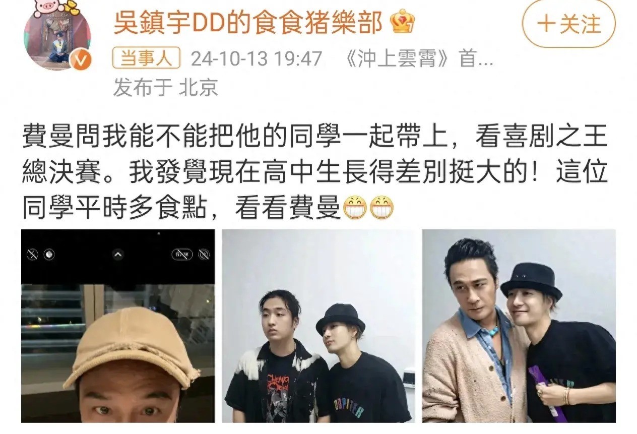 吴镇宇发文写谈:“费曼问我能不行把他的同学全部带上,看《笑剧之王》总决赛,我发现现时高中孕育得差别挺大的!这位同学闲居多吃点,望望费曼。”