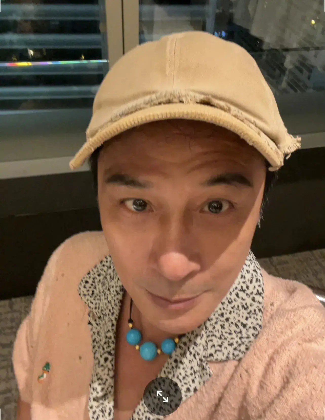 吴镇宇领先晒出了一张自拍视角,衣服粉嫩的毛衣外衣,戴着蓝色的珠子项链,头发鸭舌帽,看起来很复旧风,很即兴,很潮。