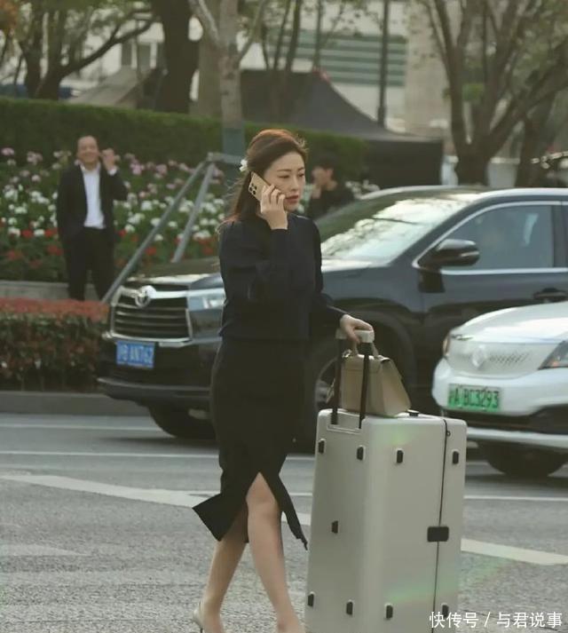 只见偶遇像片中的朱珠,上半身穿墨蓝色范例圆领衬衫,下半身则衣裳玄色鱼尾开叉包臀半身裙,秀发半挽在脑后,一边手推着大大行李箱,手包也放在行李箱上;另一只手则是举着电话逼近耳朵正在听电话。
