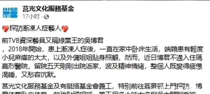 1997年,吴博君不幸被TVB裁人,为了营生他作念过清洁工,当过面包师父,劳碌一世的他,本觉得不错在退休之后安享晚年。干系词,2018年3月,气运的不幸却偷偷的莅临到了他的身上,他被确诊为渐冻东谈主症。天然强硬判辨,但七年的时候,让他从一个能来往的宽绰东谈主变为了一个弗成言语,弗成吃饭,全靠鼻胃管保管生命的病东谈主。