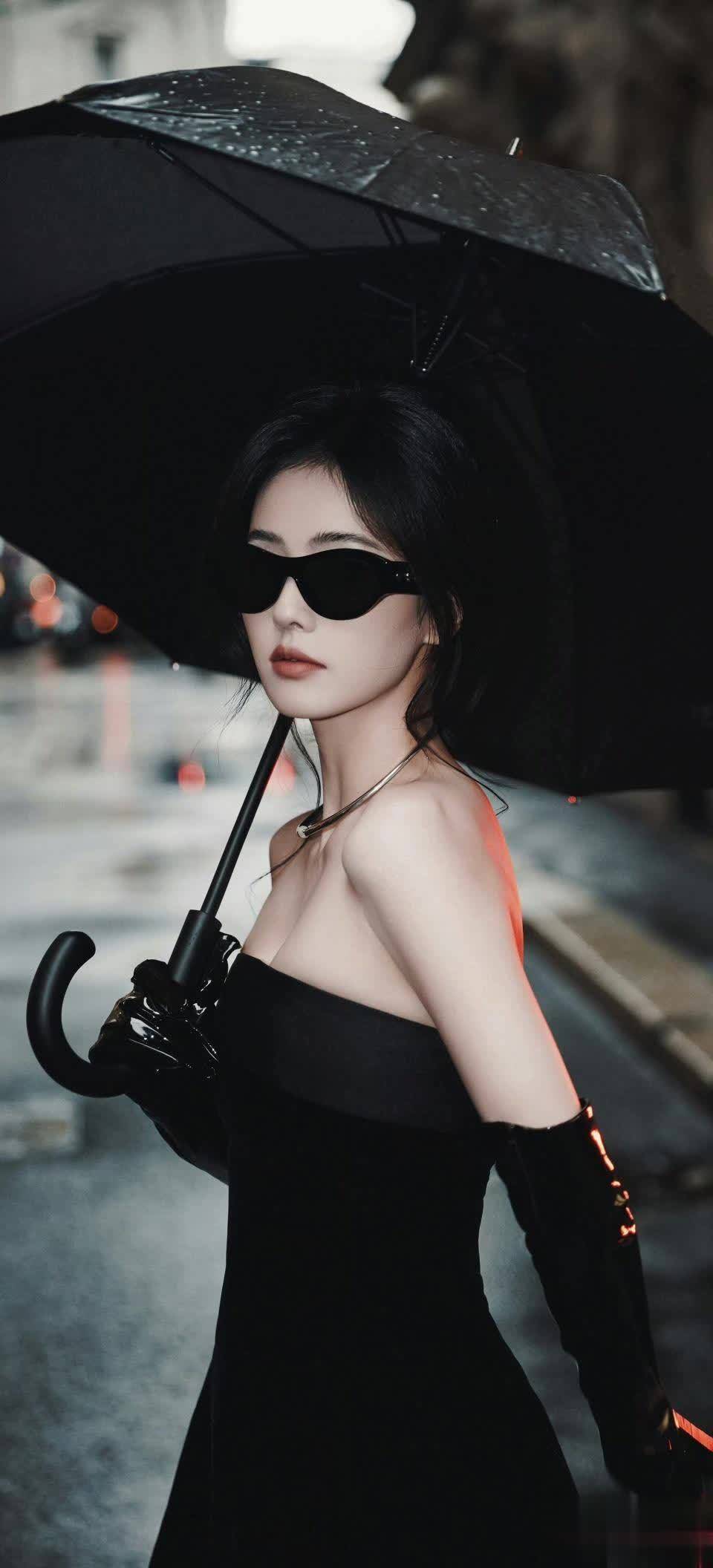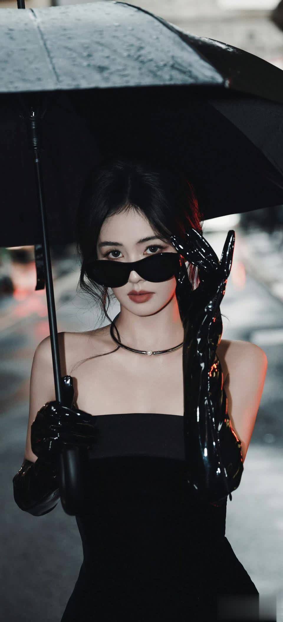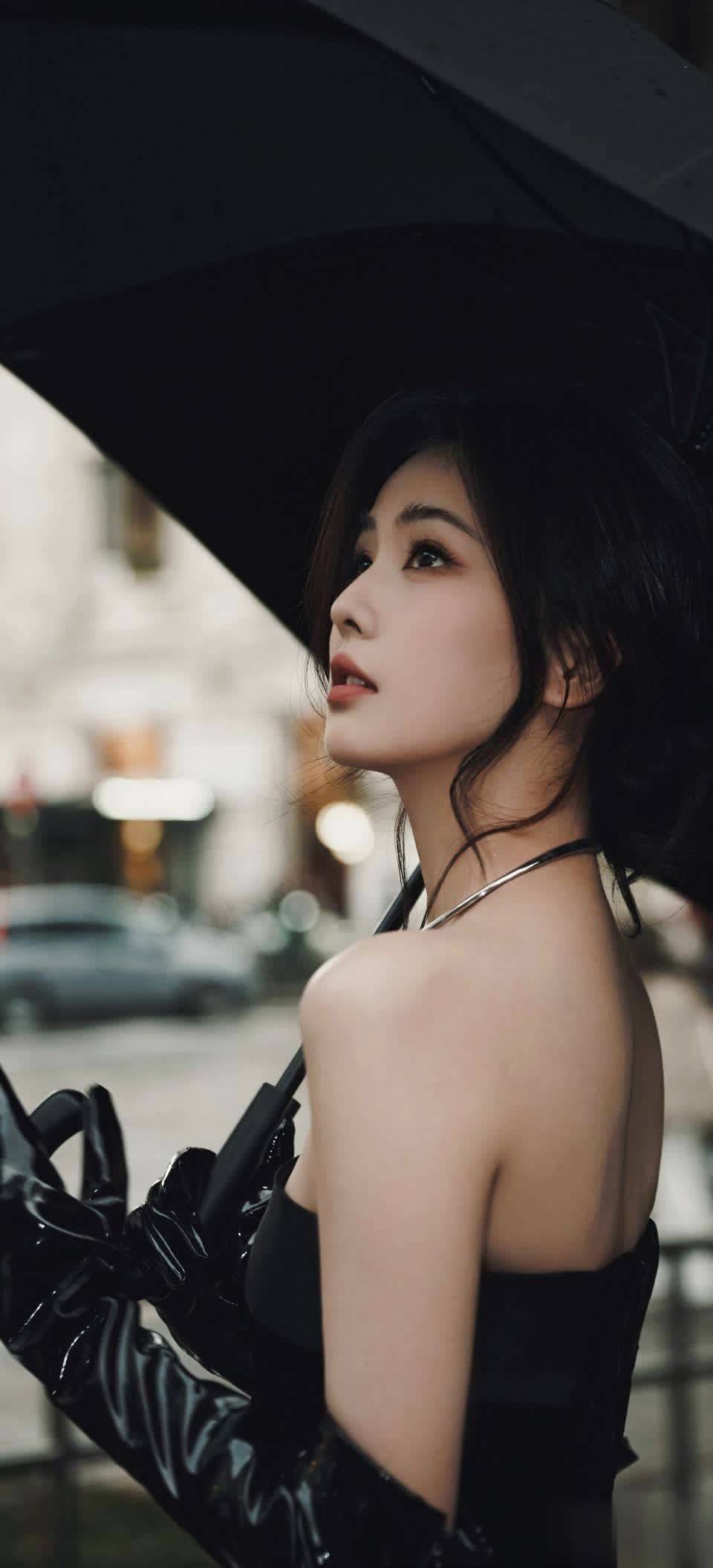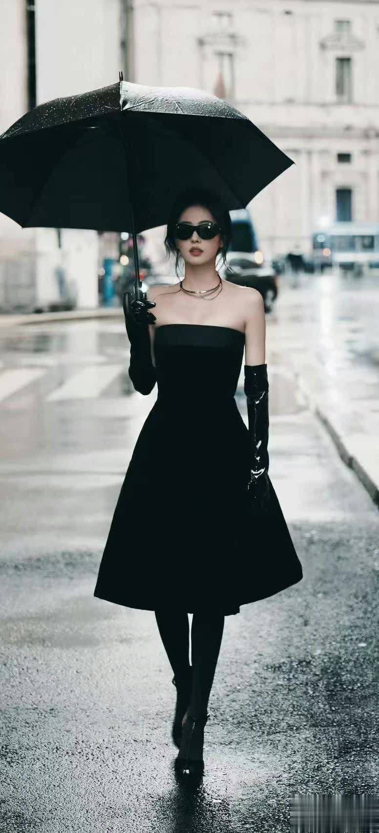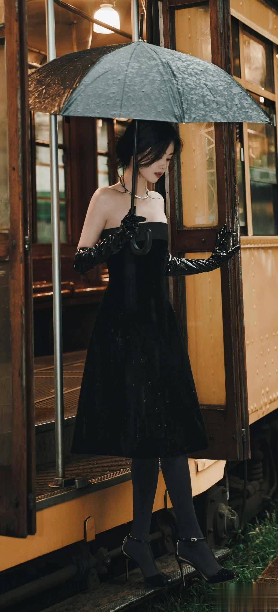 黄色车厢与黑裙变成热烈撞色。她扶车门的姿态让东说念主思起《罗马沐日》的经典场景,但雨伞上的水珠又增添当代摩登感。这种古今扶助的前卫话语,恰是白鹿团队的看家本领——毕竟从抖音古装女神到当代剧女主,她永远擅长冲破时空界限。