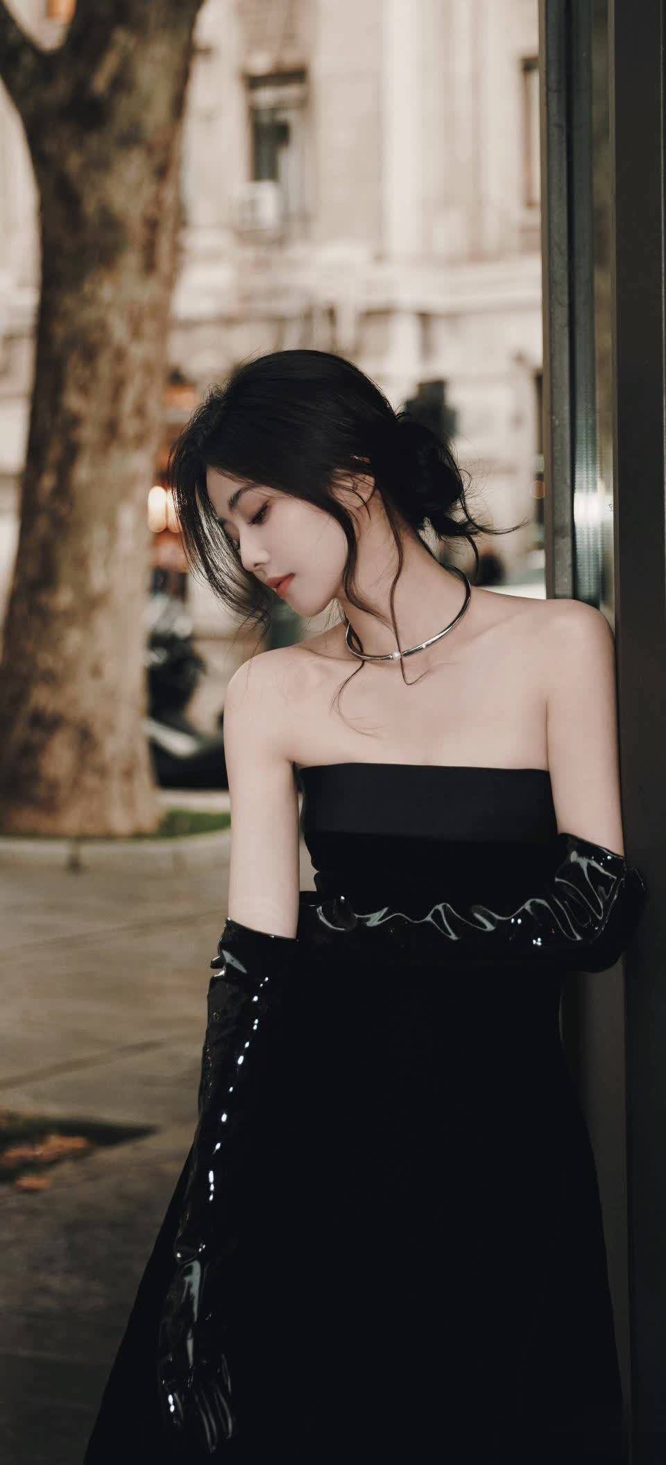 白鹿一袭玄色抹胸长裙倚靠伞下,乌黑秀发粗放挽起,几缕发丝勾画出慵懒韵味。最绝的是她望向远处的目光——莫得刻意张扬,却自带故事感。仿佛刚从相沿电影中走来,每一个细节王人在诉说优雅。