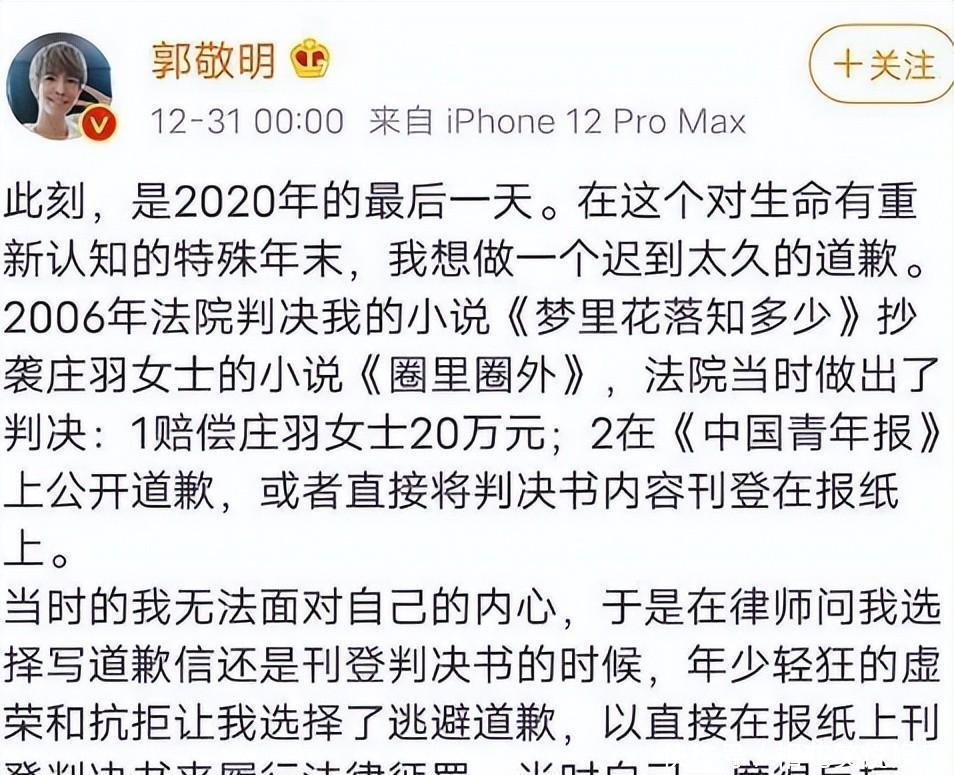 就在联名信发出的十天后,2020年12月31日的凌晨,郭敬明终于在微博上发布了那封迟到了十五年的谈歉长文。