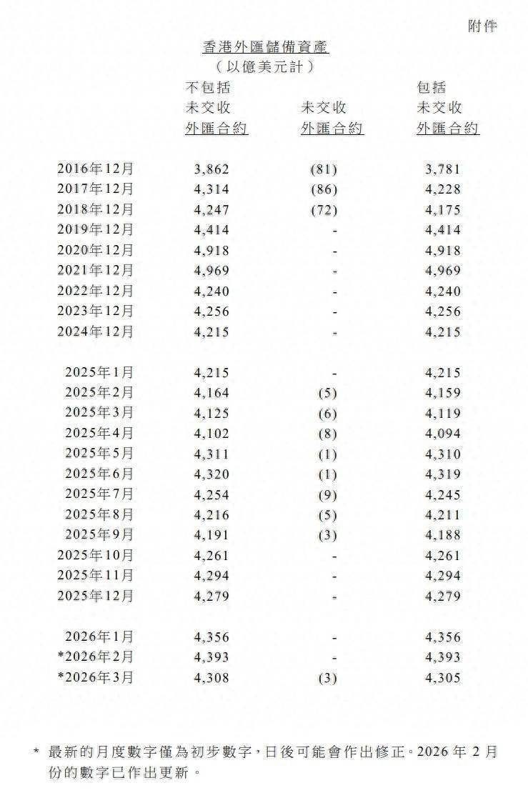 智通财经APP获悉,4月9日kaiyun网站,香港金管局公布,香港于2026年3月底的官方外汇储备财富为4308亿好意思元(2026年2月底为4393亿好意思元)。连同未交收外汇合约在内,香港于2026年3月底的外汇储备财富为4305亿好意思元(2026年2月底为4393亿好意思元)。为数4308亿好意思元的外汇储备财富总和,绝顶于香港运动货币5倍多,或港元货币供应M3约38%。