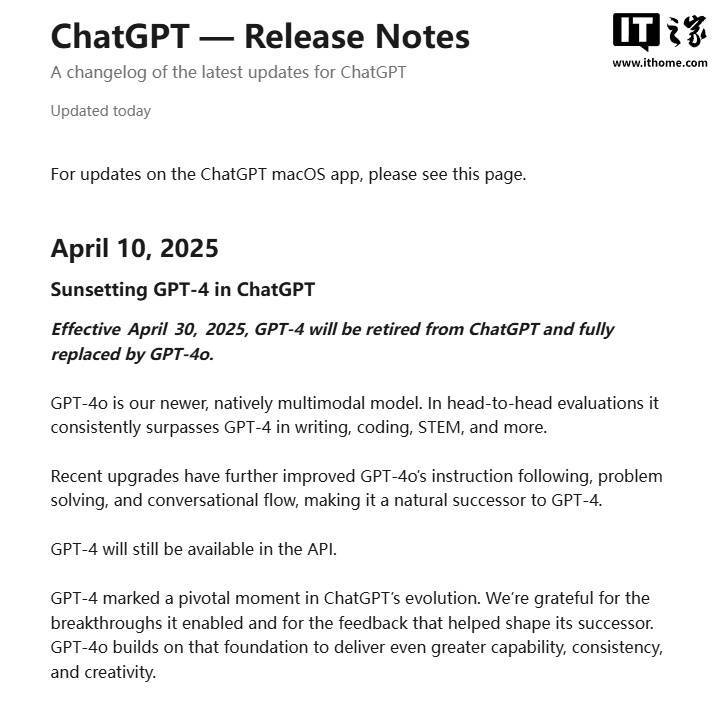 IT之家 4 月 11 日音讯,OpenAI 文牍 GPT-4 将于 4 月 30 日从 ChatGPT 中移除,但仍可在 API 中使用。OpenAI 示意开云官网登录入口,GPT-4 退役后全齐由新式原生多模态模子 GPT-4o 取代。