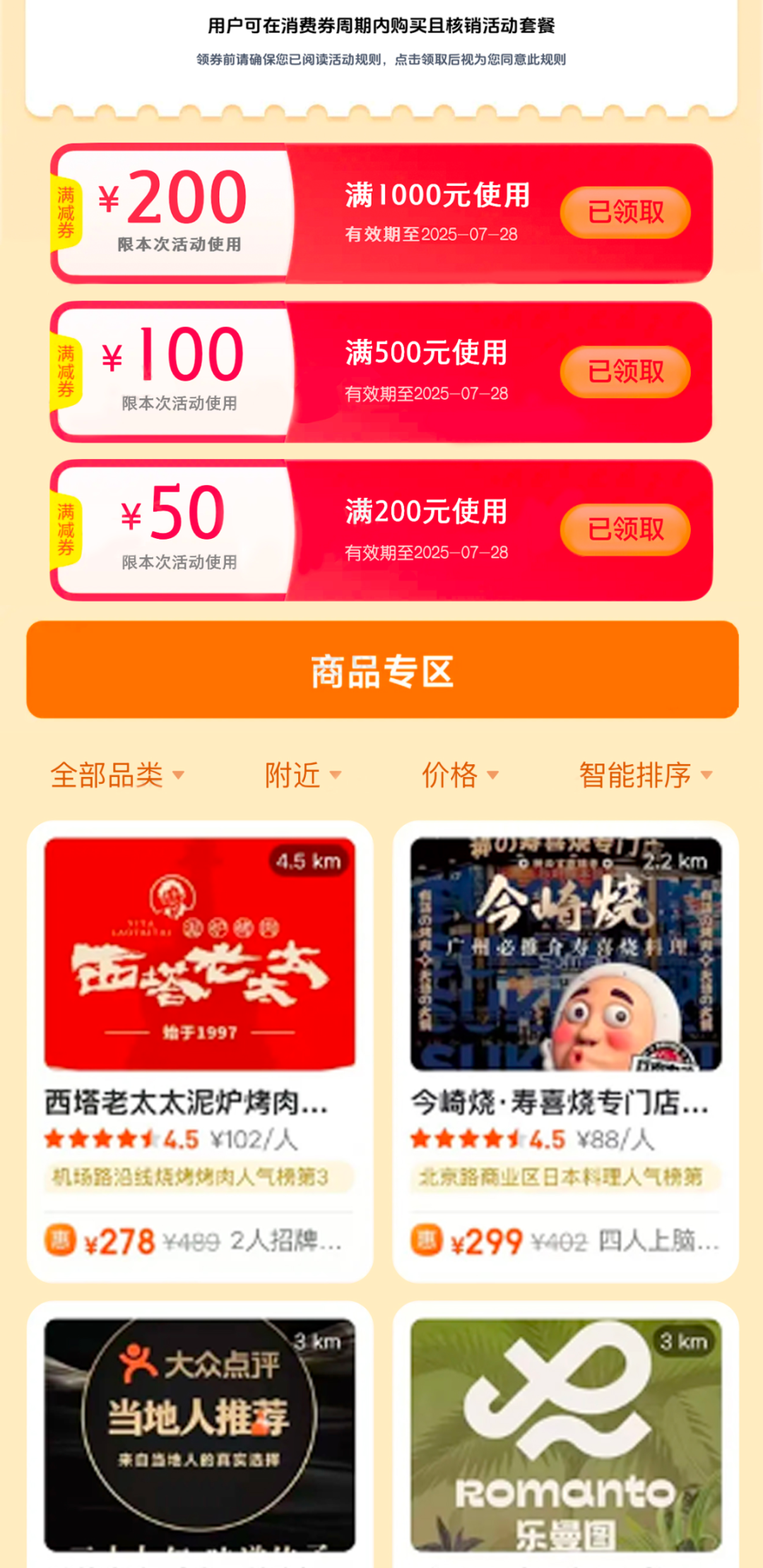 4.鄙人方“用券专区”可稽察商家列表。